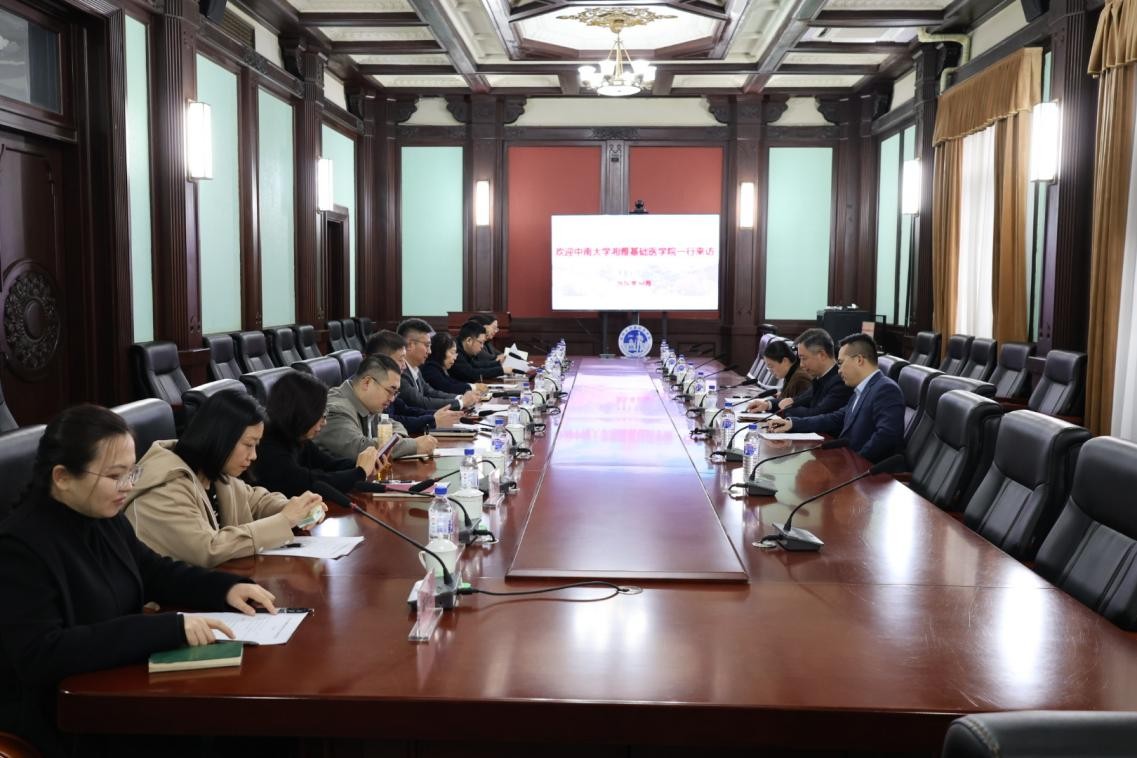 2026年4月9日上午,中南大学湘雅基础医学院院长熊炜、副院长刘俊文、副院长周勇、生物医学工程系副主任陈昊彬一行到访吉林大学基础医学院调研交流。吉林大学基础医学院院长王放、党委书记王晓荣、学院领导班子以及教师代表出席会议,双方就基础医学领域高质量发展路径深入交流、共谋合作。